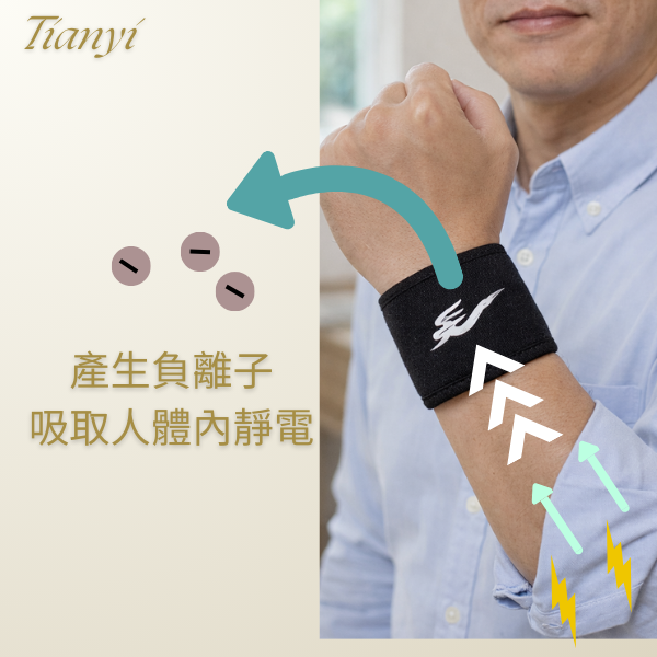 我們的產品可以吸附人體的正電,並中和靜電,也就是釋放負電荷